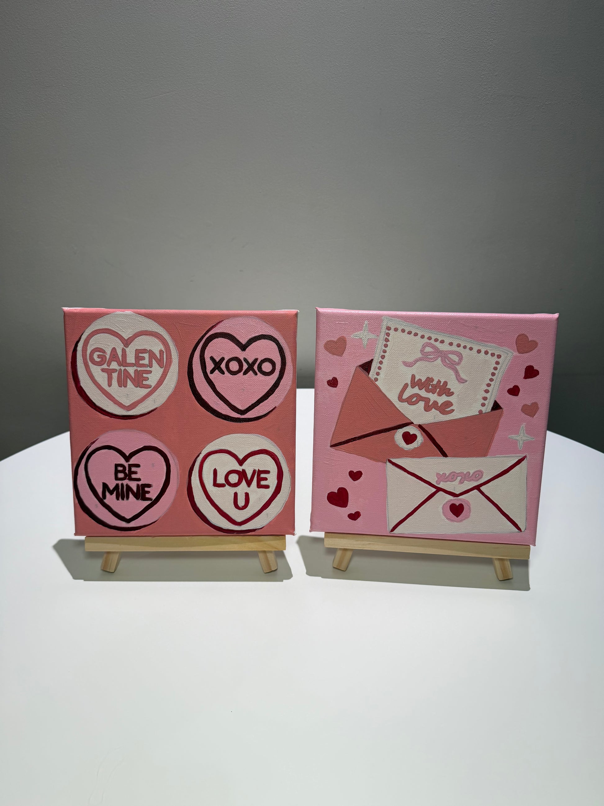 Includes 2 of the different Galentines sets: set of 5 paints each, two nylon paint brushes each, tissue to dry your brushes, a water pot. Easel you can add on as an extra, or have the prints without.