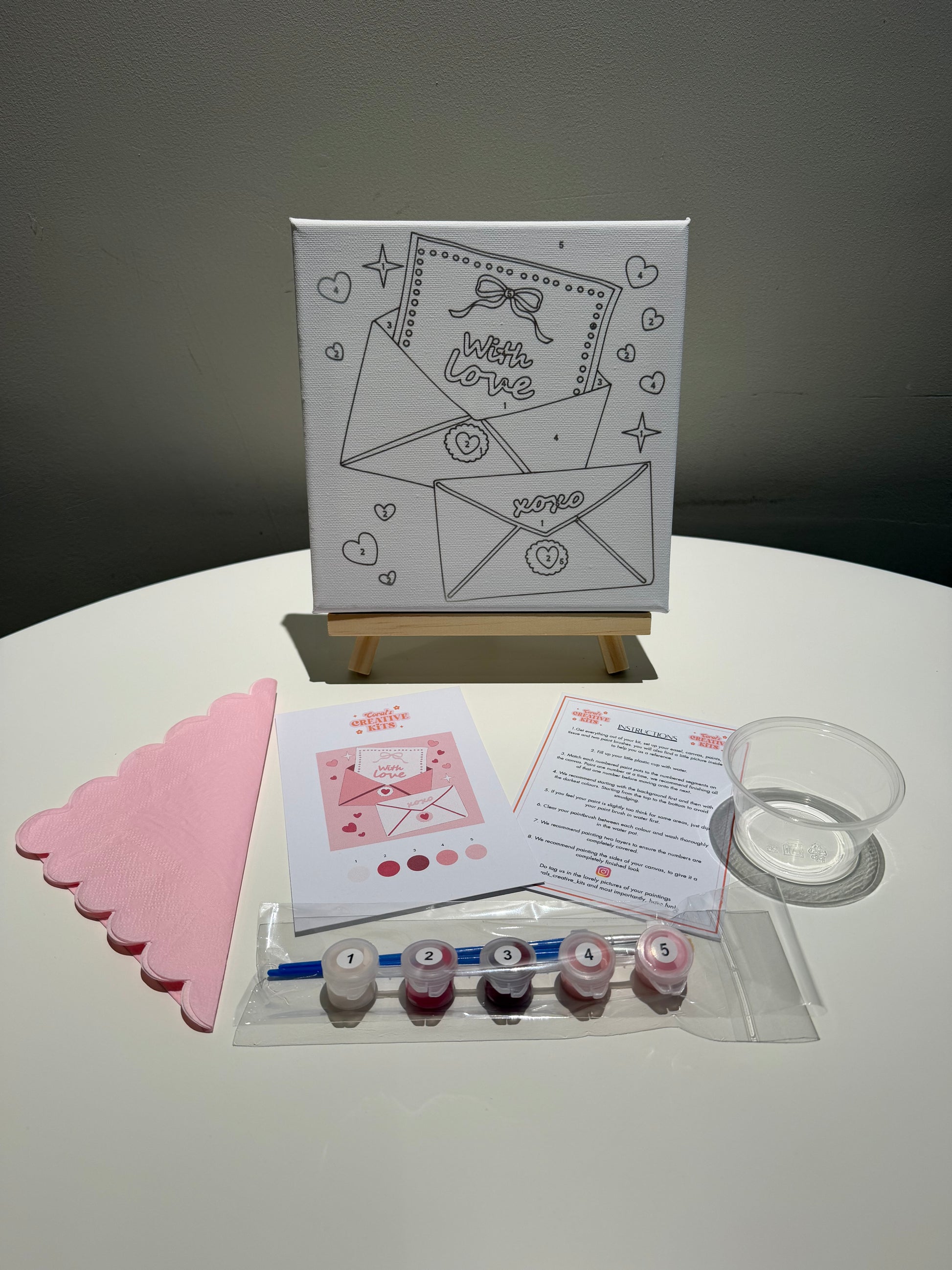 Includes: set of 5 paints, paint by numbers on a canvas board, two nylon paint brushes, tissue to dry your brushes, a water pot. Easel you can add on as an extra, or have the prints without.
