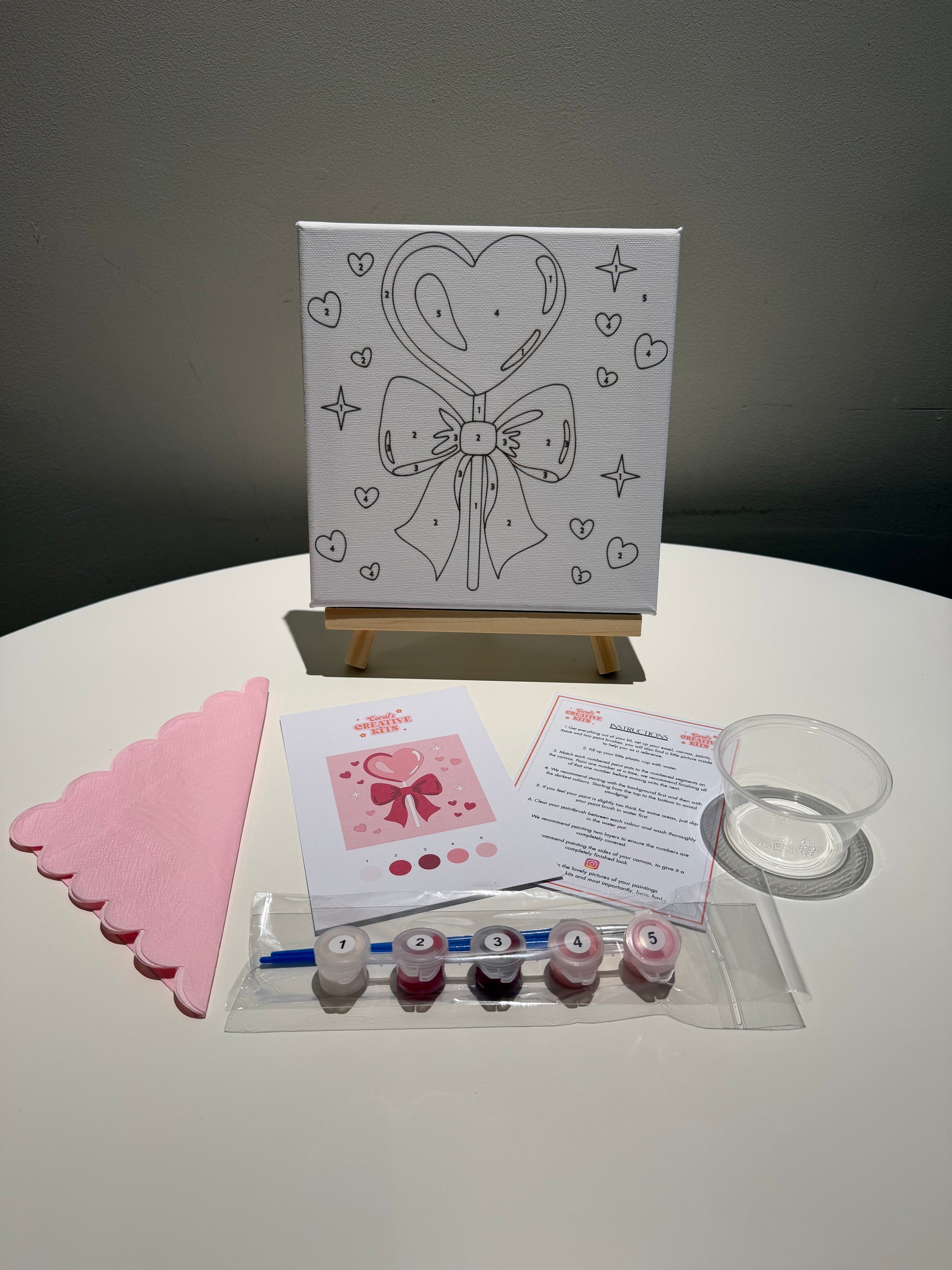 Includes: set of 5 paints, paint by numbers on a canvas board, two nylon paint brushes, tissue to dry your brushes, a water pot. Easel you can add on as an extra, or have the prints without.